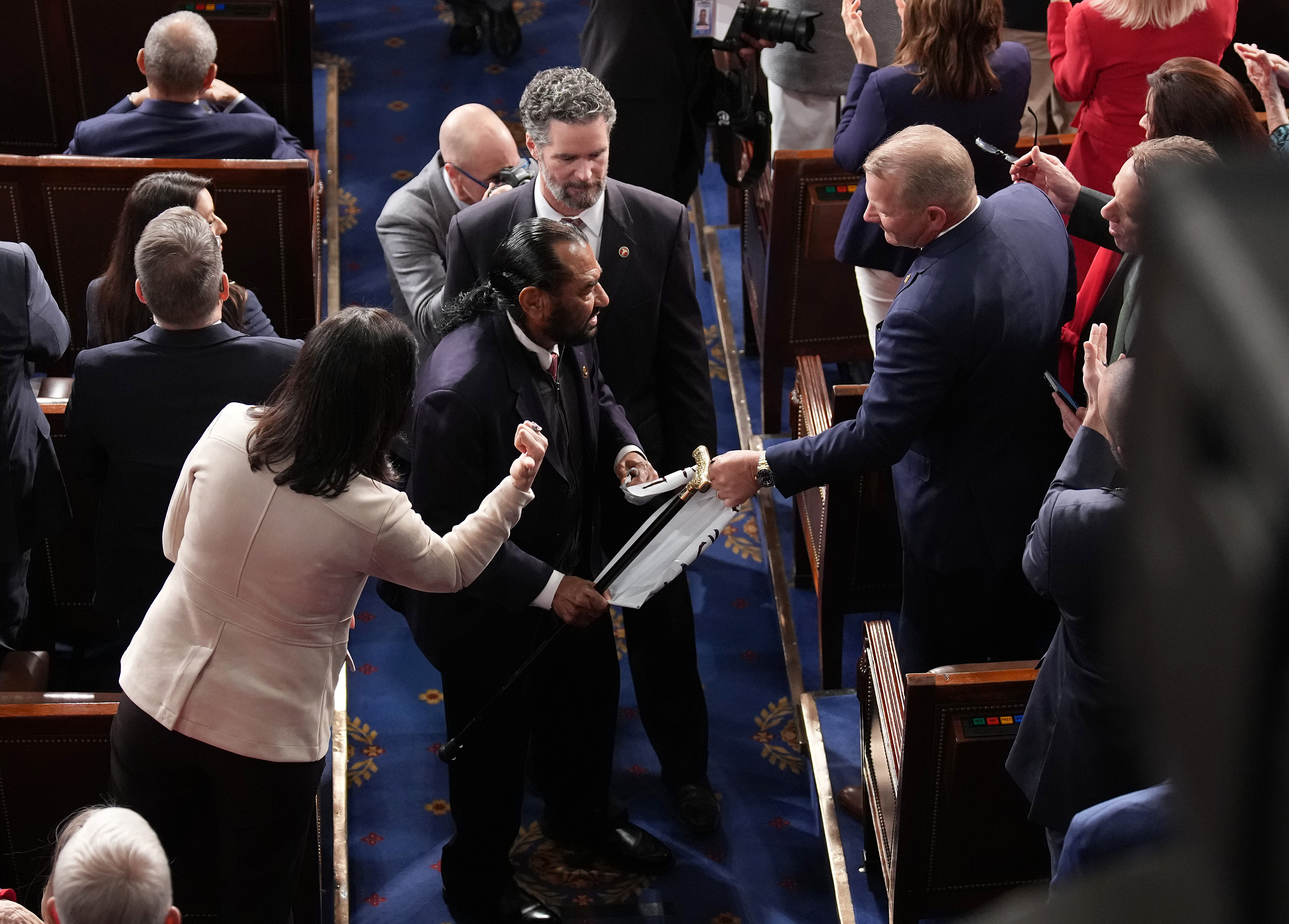 Good evening. This is your daily roundup of stories recommended just for you, based on your interests and reading history. | | | | Rep. Troy Nehls (R-Texas) grabs a sign from Rep. Al Green (D-Texas) as President Donald Trump delivers his State of the Union address Tuesday at the Capitol. (Andrew Harnik/Getty Images) | | | How was today's newsletter? | | | | | | | | | |